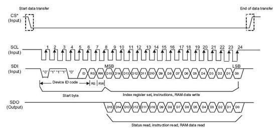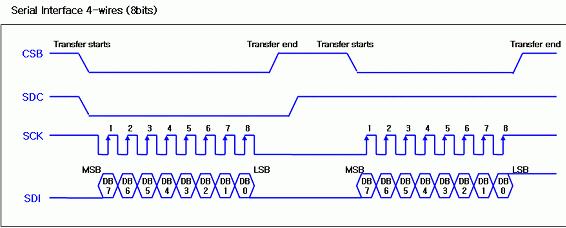 Serial interface는 SPI (Serial Peripheral Interface)라고도 하며 SDI, SDO, SCL, CS의 네 신호를 이용한다. 명령어와 display data를 SDI를 통해 전송되고 이 때, clock인 SCL에 맞춰 전송된다. SDI의 앞부분은 device ID code와 RS신호와 RW 신호를 표현하고 뒷부분에는 register 주소나 command가 들어가게 된다.