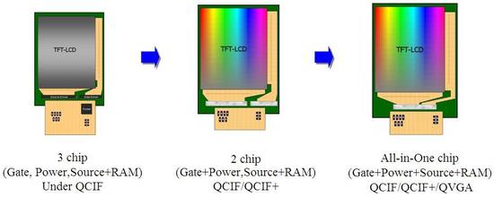 그림 1을 보면 driver IC의 개발의 변천사를 볼 수 있다. 그림에서 보는 바와 같이 IC chip들의 개수가 줄어들고 있다. 초창기에 QCIF 해상도 (176 X 220)의 경우 일반적으로 3개에서 2개의 chip을 사용하는 반면 앞에서와 설명한 바와 같이 요즘 driver IC의 경우 source, gate, power, RAM이 모두 포함되어 있는 하나의 driver IC로 구성되어 있다.