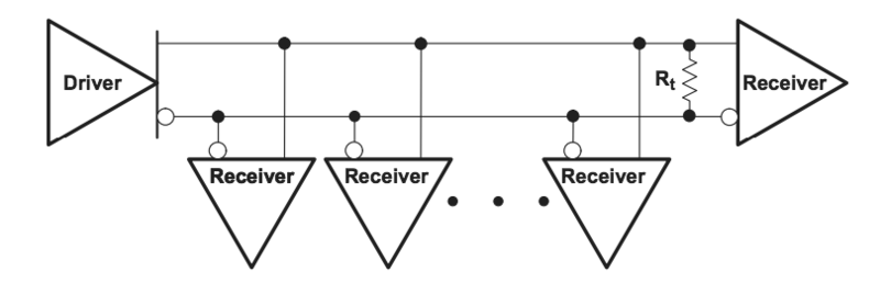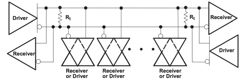 아래 그림에는 하나의 송신기(driver)와 다수의 수신기(receiver)로 구성되는 Multi-drop 방식의 일대다 연결과 다수의 송신기와 다수의 수신기로 구성되는 Multiple point 방식의 다대다 연결이 나타나 있다.