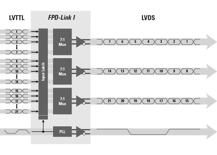 최초의 LVDS 적용은 앞에서 간략히 살펴본 바와 같이 노트북 컴퓨터의 디스플레이를 지원하기 위한 것이었다. 최초의 FPD-LINK는 18 비트의 RGB 데이터, 즉 Red 6비트, Green 6비트, Blue 6비트와 함께 Horizontal/Vertical Sync신호 및 컨트롤 신호, 그리고 클럭 신호를 포함하여 총 22개의 데이터 신호를 4쌍의 레인으로 보내기 위해 고안이 되었다. 이전에는 22개의 신호를 보내기 위해 22개의 케이블이 필요했는데 4쌍의 케이블, 즉 8개의 케이블로 22개의 신호를 전송할 수 있게 되어 비용 측면에서 66%를 절감할 수 있게 되었다.