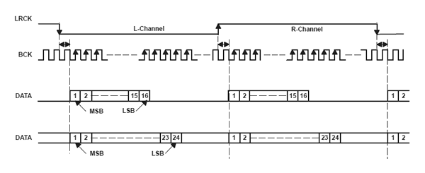 I2S는 오디오 데이터의 전송이 목적이기 때문에 데이터 프레임이란 다름 아닌 오디오 데이터를 담기 위한 포맷이며, 왼쪽과 오른쪽 채널의 구분이 있으나, 데이터의 포맷은 동일하다.