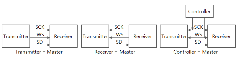 I2S는 버스 구조를 갖기 때문에 여러 대의 장치가 연결이 될 수 있다. 오디오 신호를 전송하는 기기(트랜스미터, Transmitter)와 오디오 신호를 수신하는 기기(리시버, Receiver)외에 마스터 클럭을 제공하는 기기(컨트롤러, Controller)가 연결될 수 있고, 또는 오디오 신호를 외부로부터 받아들일 수 있는 마이크 장치가 버스에 연결될 수 있다. 일반적으로 트랜스미터는 CPU, 혹은 마이크로 프로세서에 해당하고, 리시버는 디지털 신호를 아날로그 신호로 변환하여 스피커로 보내 주는 오디오 장치에 해당한다.