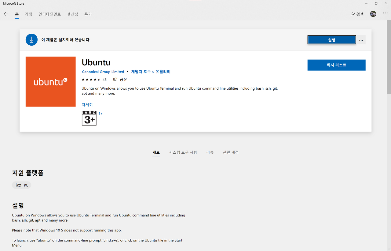 위와 같은 수많은 버전을 지원하고 있습니다. 저는 Ubuntu를 설치해보겠습니다. Windows store에서 검색하여 원하는 os를 설치합니다.