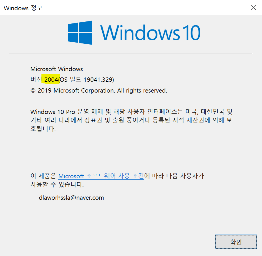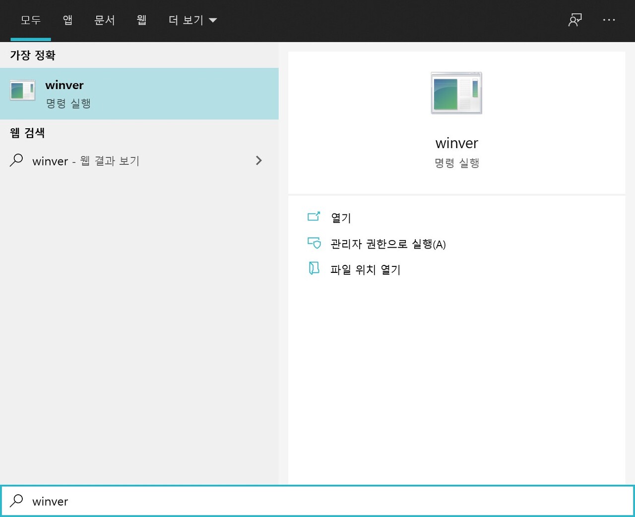 윈도우 10 에서는 WSL를 지원하며, 성능이 더 향상된 버전인 WSL2는 windows 2004(20H1) version에서 지원합니다. 상세 버전을 확인하는 방법은 윈도우 버튼 + R -> winver입력 후 실행을 통하여 확인할 수 있습니다.