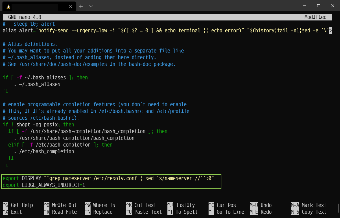 export DISPLAY="`grep nameserver /etc/resolv.conf | sed 's/nameserver //'`:0" export LIBGL_ALWAYS_INDIRECT=1그리고 연결될 때마다 해당 명령어가 적용되도록 홈에 위치한 .bashrc 파일에도 추가해줍니다.